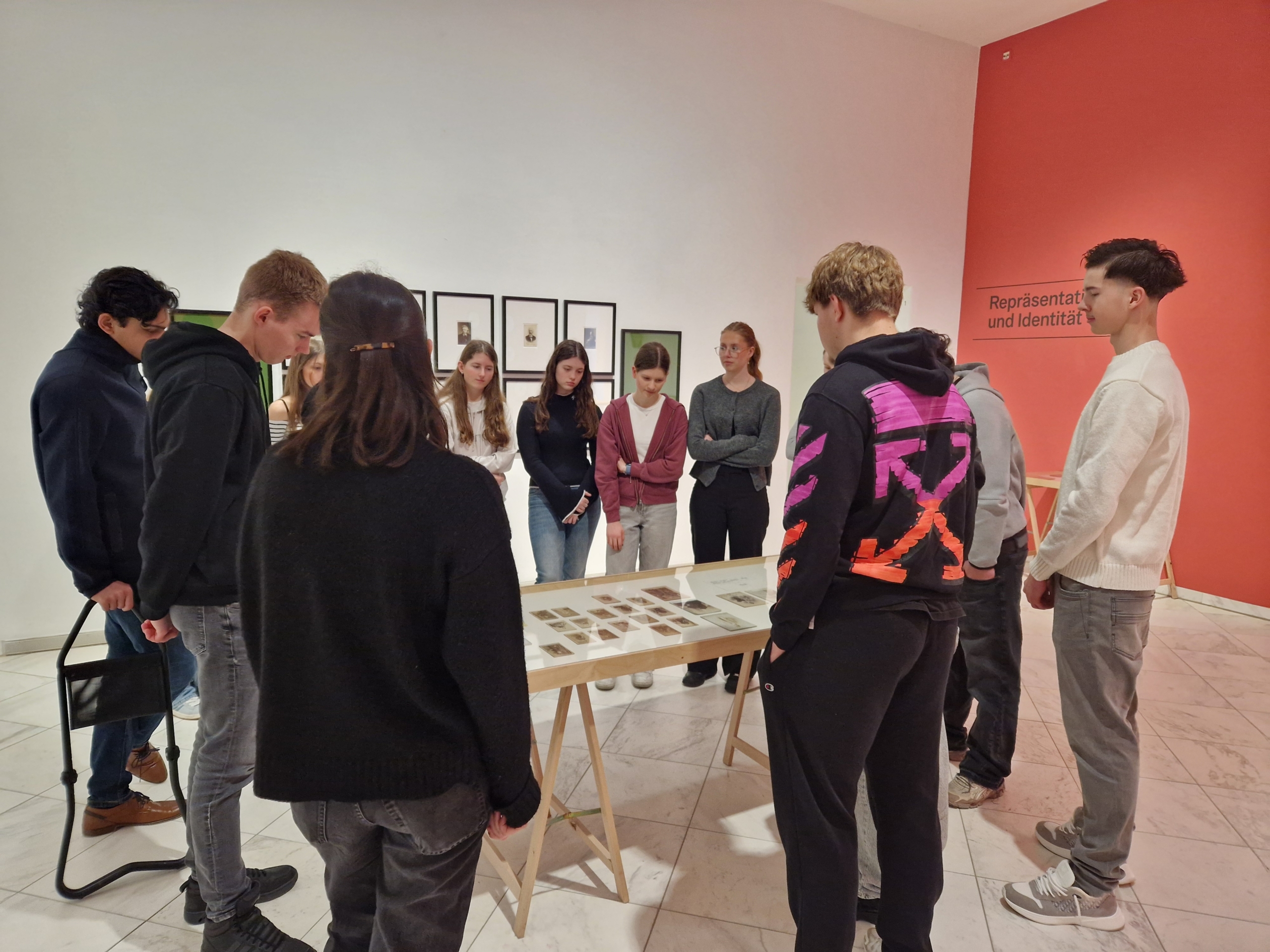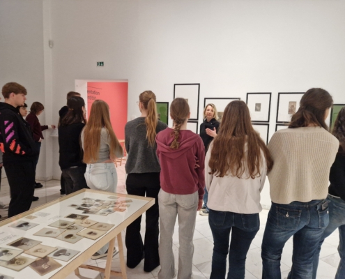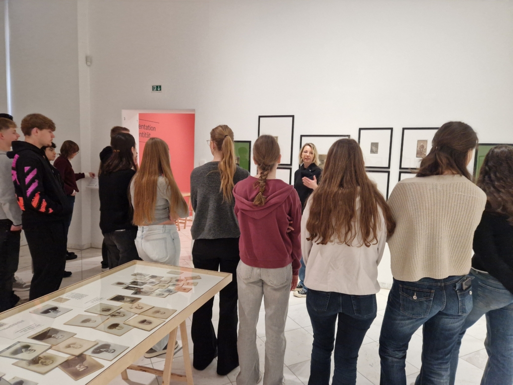 Zu Beginn besuchte die Gruppe eine Ausstellung zur Porträtfotografie. Anhand verschiedener Beispiele konnten die Schülerinnen und Schüler nachvollziehen, wie sich die Porträtfotografie im Laufe der Zeit verändert hat: von frühen, eher dokumentarischen Aufnahmen über Visitenkartenporträts, die an Bekannte verteilt wurden, bis hin zu experimentellen und künstlerischen Fotografien. Besonders spannend war dabei der Blick auf die technischen Anfänge der Fotografie. Während heute fast jeder täglich zahlreiche Fotos mit dem Smartphone macht, benötigten die ersten Fotografien Belichtungszeiten von bis zu acht Stunden!