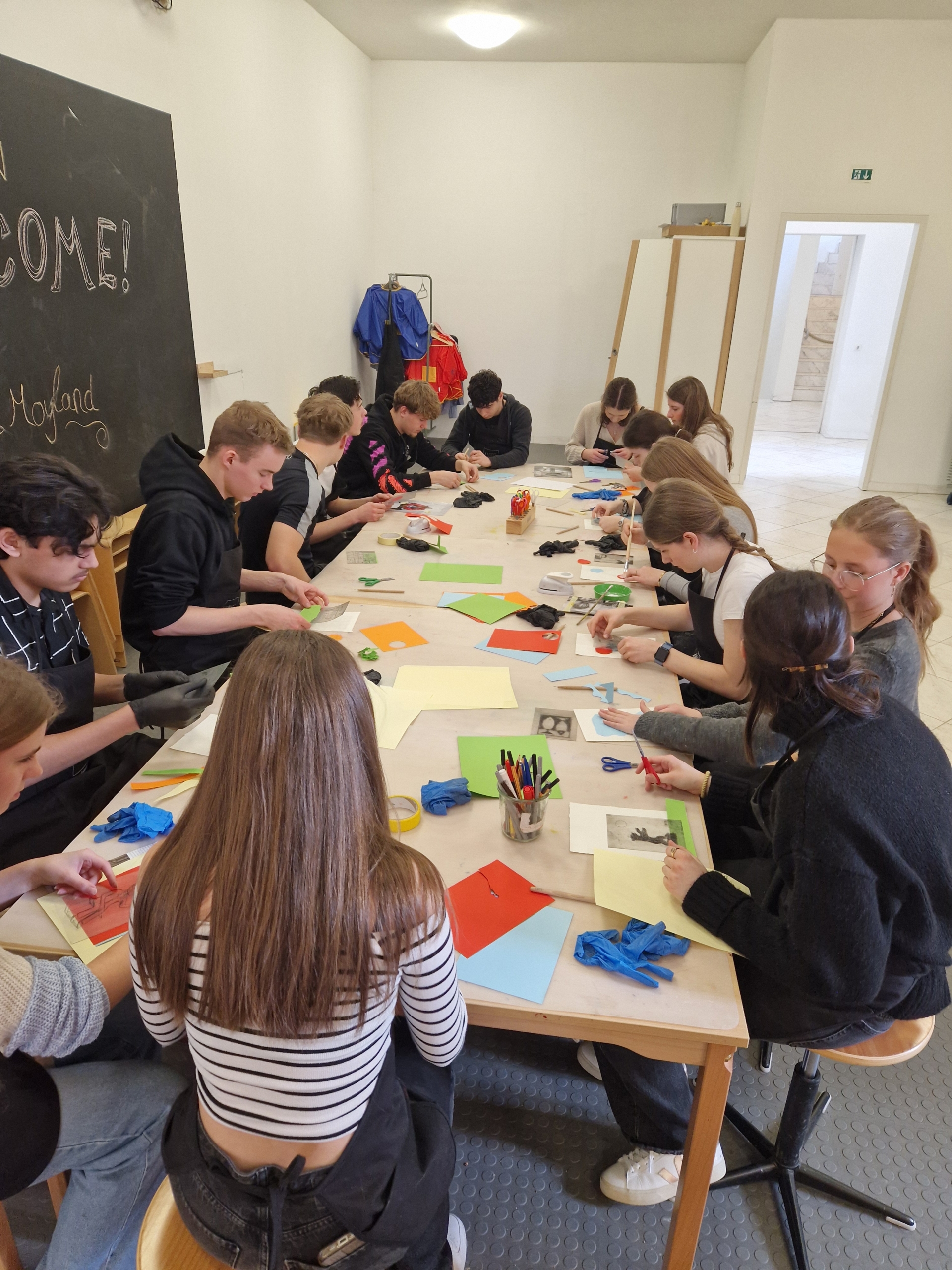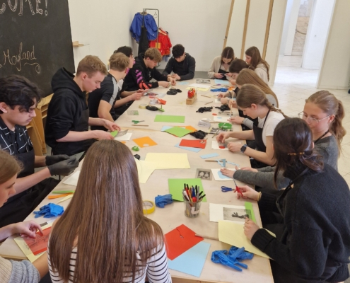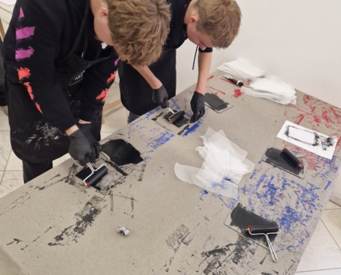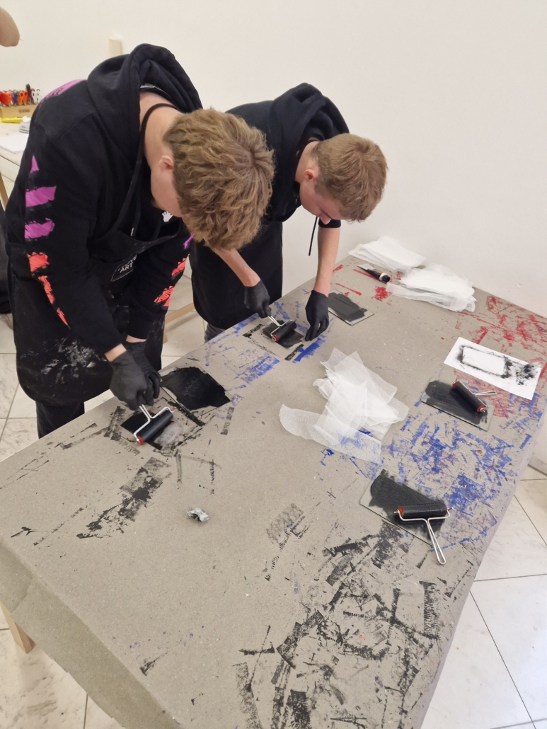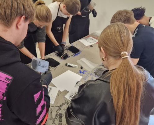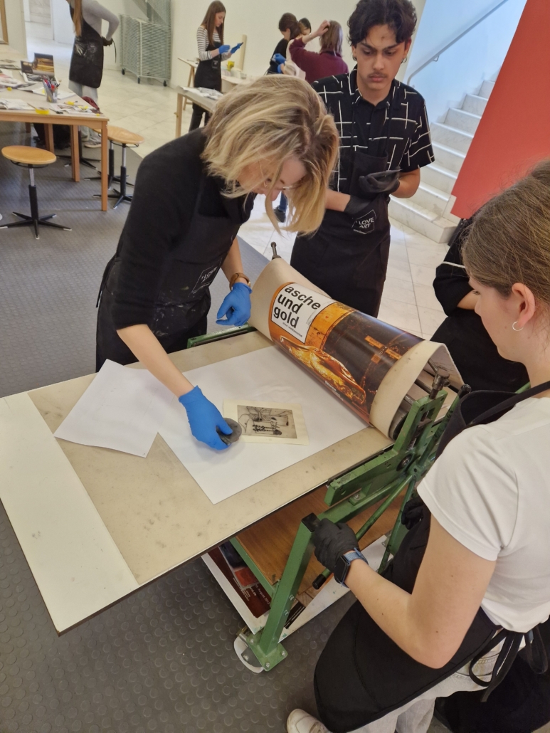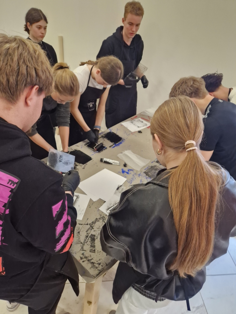 Nach dem Ausstellungsbesuch durften die Schülerinnen und Schüler selbst kreativ werden. In einem Workshop zur Kaltnadelradierung und Chine-Collé konnten sie selbst kreativ werden. Dabei werden Motive mit einer spitzen Nadel in eine Druckplatte eingeritzt, anschließend eingefärbt und mithilfe einer Druckerpresse auf Papier gedruckt. Unter fachkundiger Anleitung konnten alle eigene Motive gestalten und ihre ersten Drucke herstellen. Das zusätzliche Bekleben des Papieres mit bunten Blättern war eine ganz neue künstlerische Herausforderung.