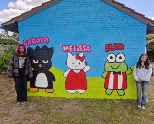Am Anfang haben wir zusammen Ideen gesammelt und überlegt, welche Comic Figuren wir auf das Stromhäuschen malen wollen. Erste Entwürfe sind entstanden und wurden nach und nach angepasst und zusammengestellt. Wir haben in Gruppen gearbeitet und uns gegenseitig geholfen. Nachdem wir schon in der Woche zuvor erste Sprayversuche machen konnten, wurde es dann ernst und wir verewigten unsere Zeichnungen auf dem Stromhäuschen. Am Ende ist ein buntes Kunstwerk entstanden, auf das wir alle stolz sind.