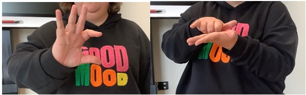 Gemeinsam mit den Schüler*innen ging Frau Utz auch das Fingeralphabet durch und stellte einzelne Gebärden für Orte oder Persönlichkeiten vor. Zwei dieser Gebärden seht ihr auch auf den Fotos: Auf dem einen ist das Zeichen für „WC“ zu sehen, das andere steht für „New York“. Am Beispiel der amerikanischen Stadt erklärte Frau Utz auch, dass es sowohl offizielle als auch inoffizielle Gebärden gibt. Die inoffizielle Gebärde für „New York“ bezieht sich etwa auf den Anschlag auf das World Trade Center – ein Hinweis darauf, wie stark auch kulturelle Ereignisse Einfluss auf Gebärden nehmen können.